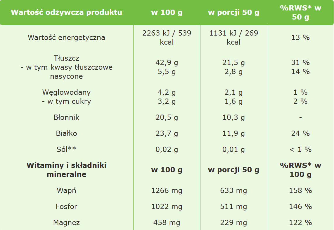 *RWS – Referencyjne Wartości Spożycia przeciętnej osoby dorosłej (8400kJ/2000kcal).