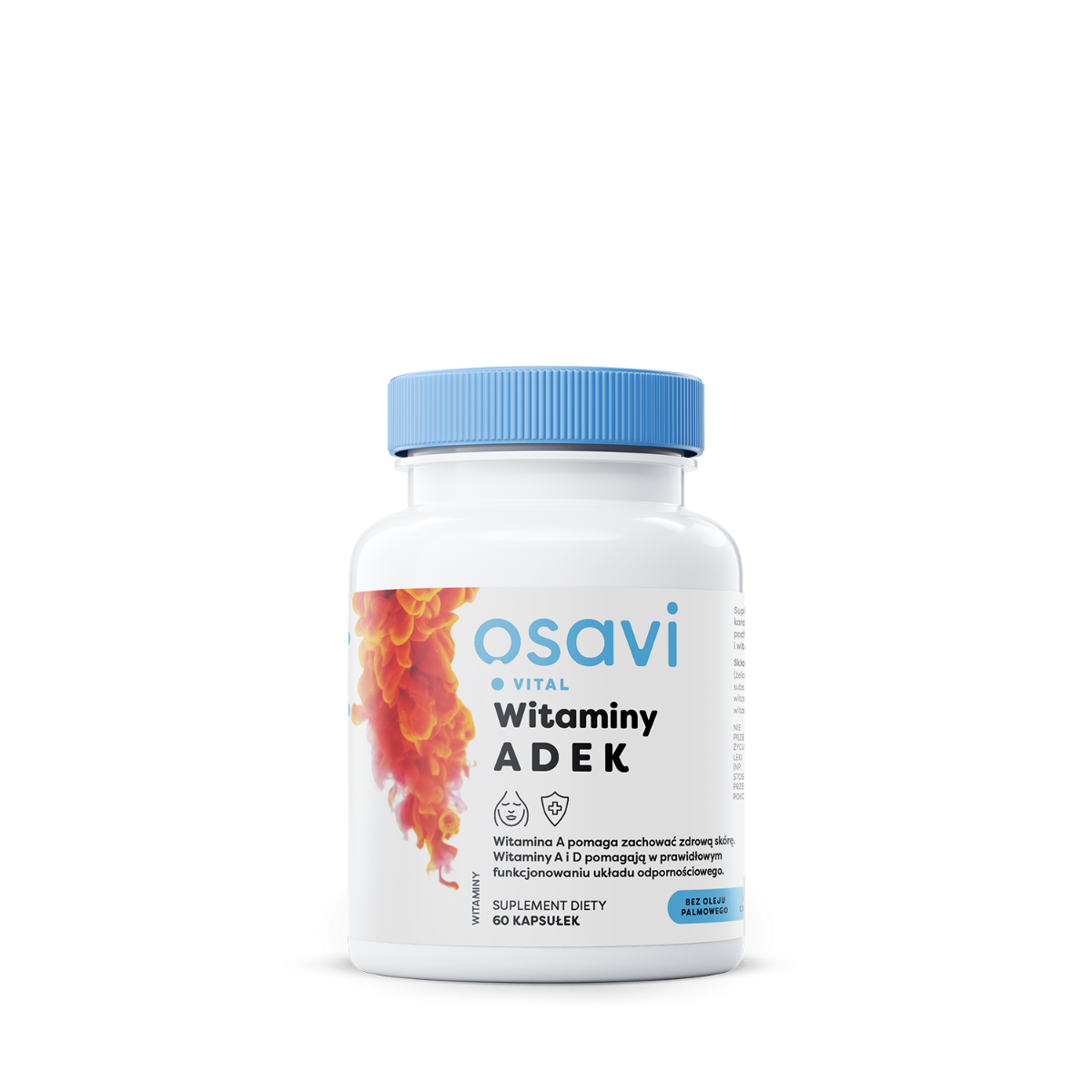 Witaminy ADEK to połączenie czterech substancji: naturalnego beta-karotenu z alg Dunaliella salina (prowitaminy A), stabilnej i biodostępnej formy witaminy D3 naturalnie pozyskiwanej z lanoliny (Quali®-D), naturalnej i najlepiej przyswajalnej formy witaminy E (D-alfa-tokoferolu) oraz wysoce wchłanialnej witaminy K2 (K2VITAL®MK7). Witaminy ADEK od OSAVI mają postać łatwych do połknięcia miękkich kapsułek, które wypełniono olejem MCT pozyskiwanym jedynie z oleju produkowanego z owocu palmy kokosowej Cocos nucifera. W zalecanej dziennej porcji (1 kapsułka), którą zalecamy przyjmować z posiłkiem lub bezpośrednio po nim, znajduje się 800 μg witaminy A, 12 mg witaminy E, 75 μg witaminy K (100% RWS) oraz 1000 IU = 25 μg witaminy D3 (500% RWS).